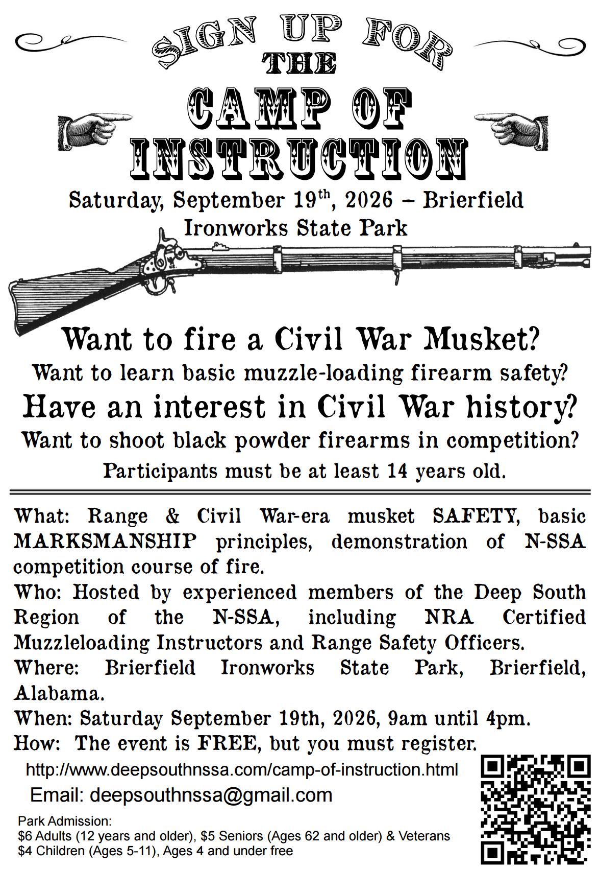 The Deep South Region of the North-South Skirmish Association will be hosting a CAMP OF INSTRUCTION RECRUIT SKIRMISH on Saturday, September 19th, 2026, at Brierfield Ironworks State Park from 9am to 4pm.